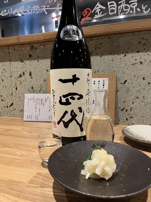 これ最強のアテきた。いか昆布じめ。それを細切りにして柚子散らしたやつ。最強に日本酒進むね。ってことでメニュー外の十四代失礼します。